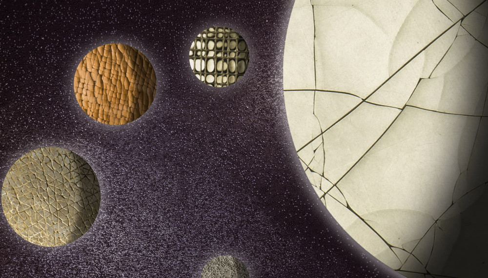 A mix of materials – resin, kaolin, reconstituted stone – and techniques – moulding, cracking, application of metallized glass marbles – for these decorative panels with a more than perfect cosmic rendering.