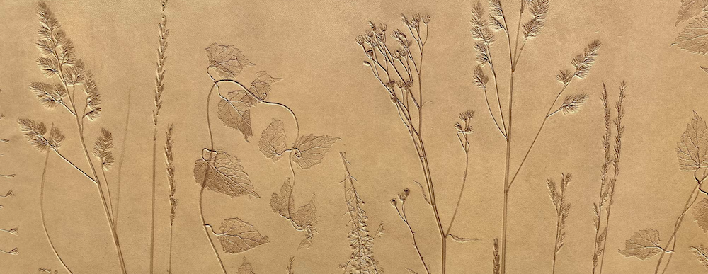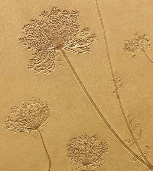 Tout commence par la récolte minutieuse de fleurs et de plantes, choisies à la main. Délicates, elles se brisent au fil du processus, mais leur beauté est préservée. À travers un procédé artisanal d’embossage, leur empreinte se grave dans le cuir souple, capturant chaque détail avec une précision remarquable – comme une signature naturelle, unique et précieuse.