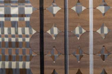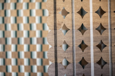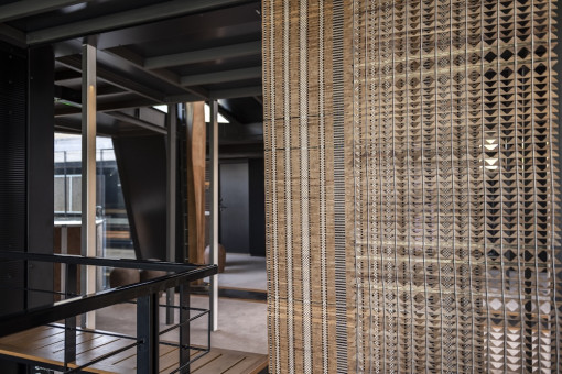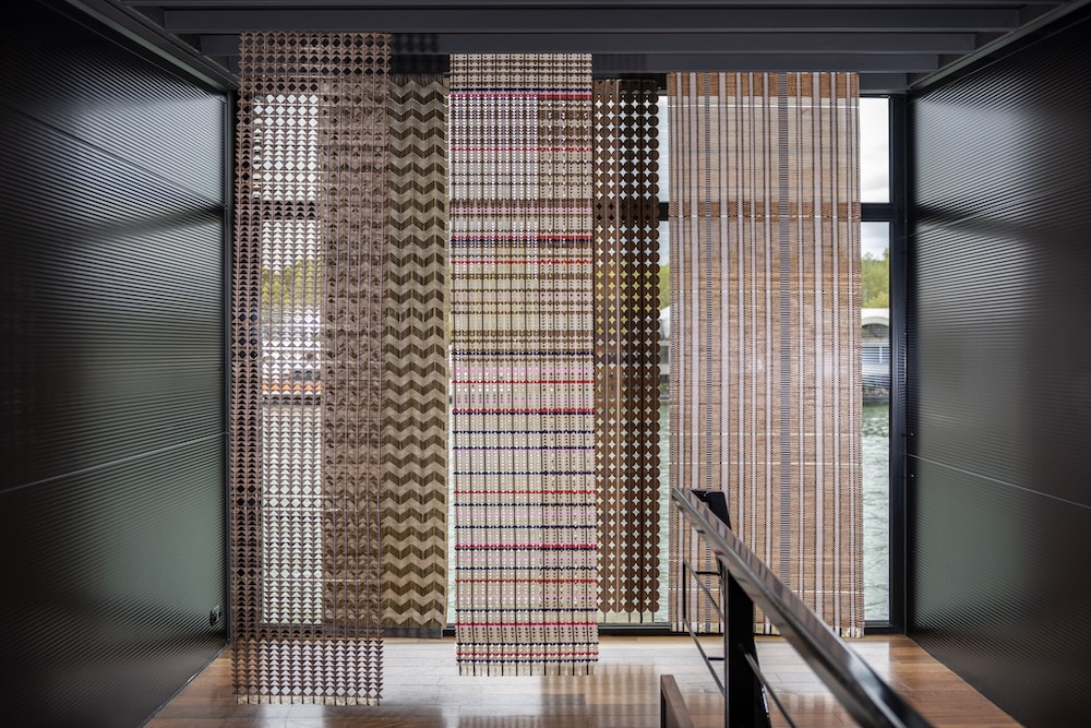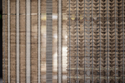 Par le jeu de découpes plus ou moins ajourées et l’insertion de fils métal, il est également possible de temporiser l’opacité des pièces, pour créer des canopées aux rythmes anguleux ou ronds, réguliers ou saccadés, filtrant la lumière au grès de vos besoins.